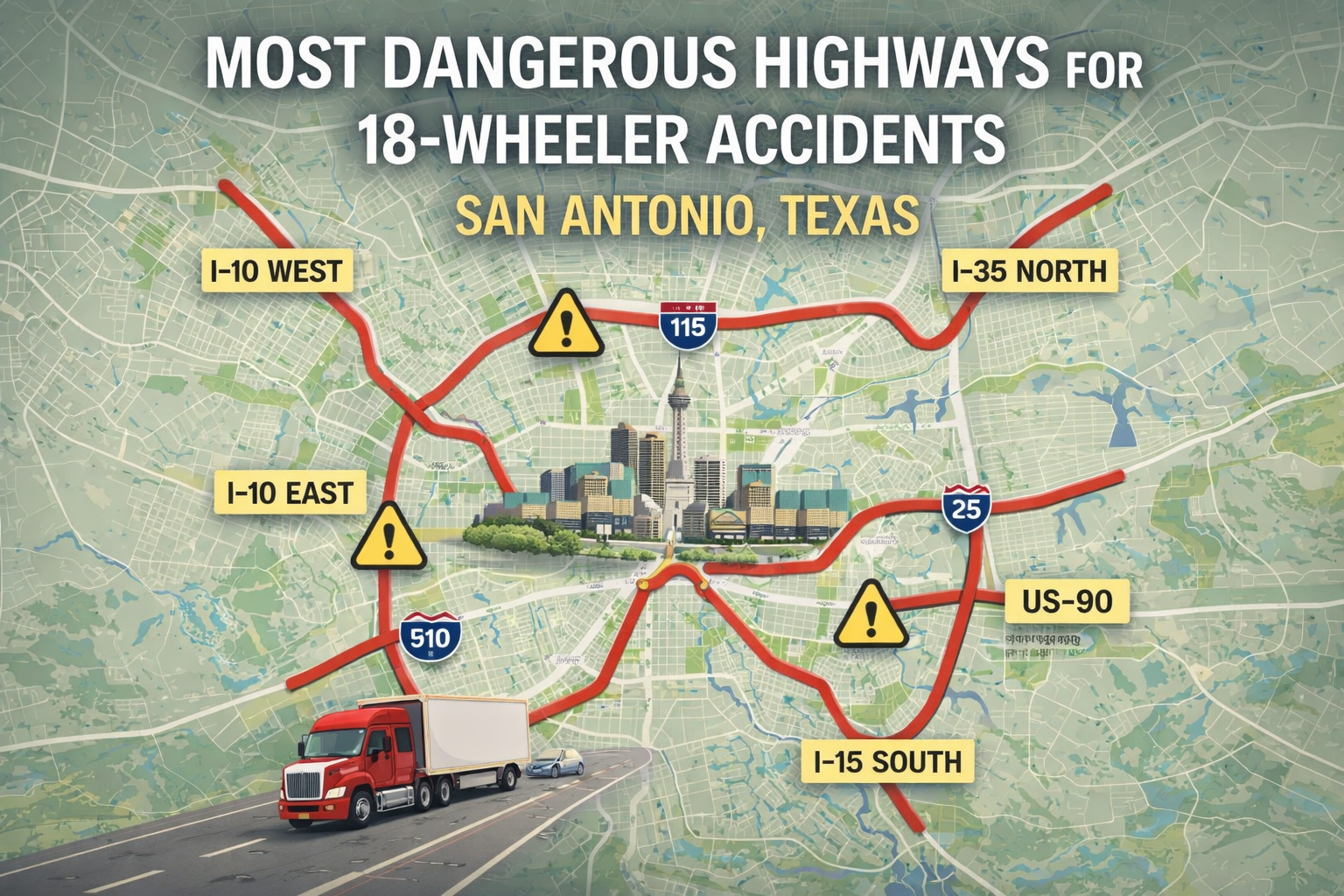 I-10, I-35, Loop 410, and US-90 are the most accident-prone highways in San Antonio for commercial trucks.