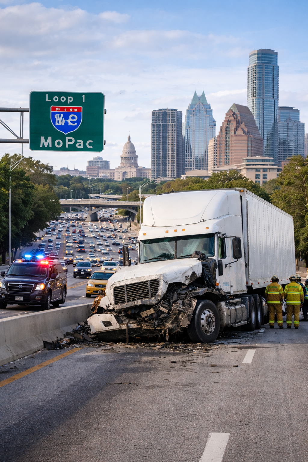 Aftermath of an 18-wheeler truck accident on a busy Austin highway